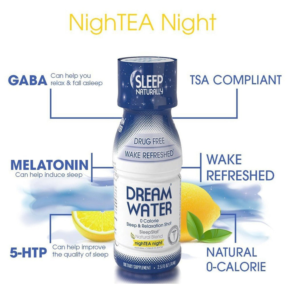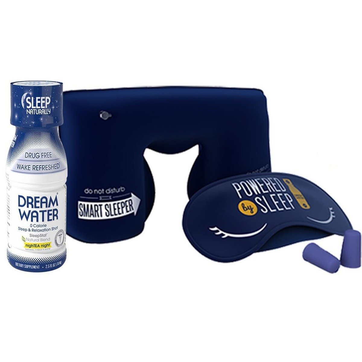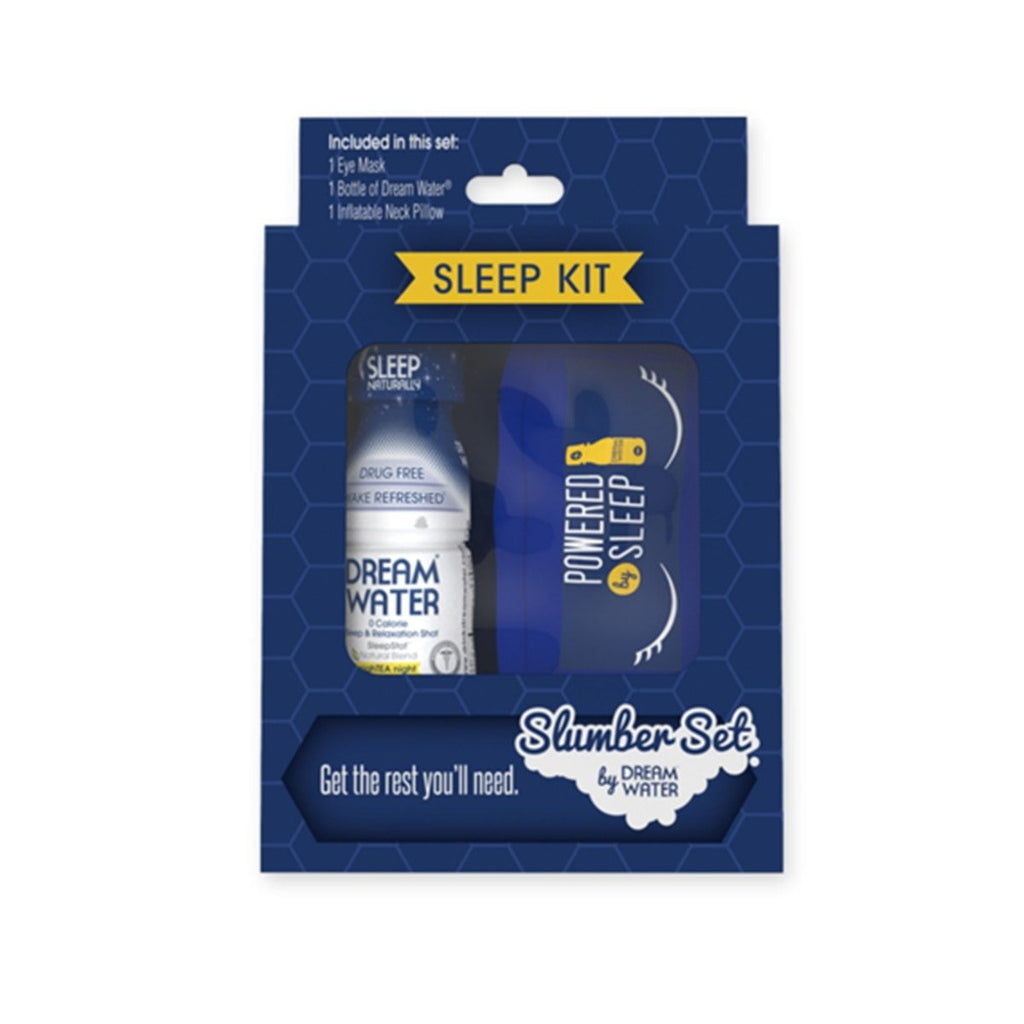 The Sleep Kit is a convenient pack that includes 1 Eye Mask, 1 Inflatable Neck Pillow, 1 set of Earplugs, 1 Dream Water Sleep Shot Dream Water is the leading sleep and relaxation shot and powder, natural, drug-free, & fast-acting helps you wake up feeling rested and rejuvenated These five components can help every